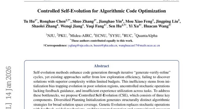 最近,来自北京大学、南京大学、中山大学、华东师范大学、中国人民大学以及美的AI创新中心等多所知名院校和企业的联合研究团队,在2026年1月发表了一篇题为"ControlledSelf-EvolutionforAlgorithmicCodeOptimization"的重要论文。这项研究就像给AI配了一位经验丰富的驾驶教练,让它不仅能写出能跑的代码,还能写出跑得又快又省资源的优质代码。